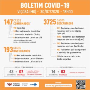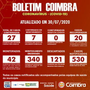 Boletim Diário, atualizações sobre coronavírus em Coimbra, 30/07/2020. ?Todos os casos que testaram positivo para covid-19 descritos no boletim são confirmados por exames laboratoriais. ☑A Secretaria Municipal de Saúde informa