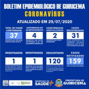 Boletim Diário, atualizações sobre coronavírus em Guiricema, 29/07/2020. ⠀ A Prefeitura Municipal de Guiricema, através da secretaria de saúde, segue o protocolo do estado e preza pela transparência nos dados,