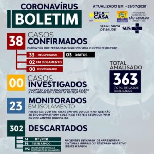 A Prefeitura Municipal de São Geraldo comunica aos munícipes as últimas informações atualizadas do Boletim Epidemiológico do município. Foi registrado nesta quarta-feira (29), 1 novo caso de paciente que testou