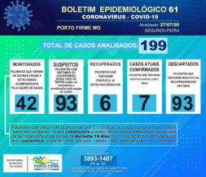 Nessa segunda-feira (27), Porto Firme registrou mais três casos confirmados de COVID-19. Porto Firme possui 42 casos monitorados, 93 casos suspeitos, 6 casos recuperados, 7 casos atuais confirmados e 93