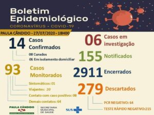 A Prefeitura de Paula Cândido confirmou 5 novos casos de COVID-19 em nosso município, todos na zona urbana. Com isso, temos um total de 14 casos confirmados, sendo que 8