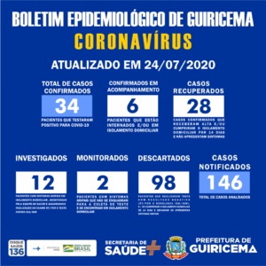 Boletim Diário, atualizações sobre coronavírus em Guiricema, 24/07/2020. ⠀ A Prefeitura Municipal de Guiricema, através da secretaria de saúde, segue o protocolo do estado e preza pela transparência nos dados,