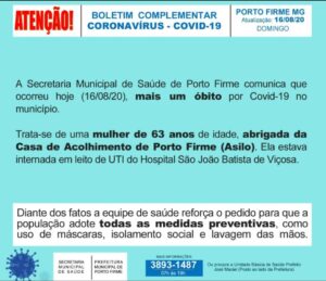 A Secretaria Municipal de Saúde de Porto Firme comunica que ocorreu neste domingo (16), mais um óbito por COVID-19 no município. Trata-se de uma mulher, de 63 anos de idade,