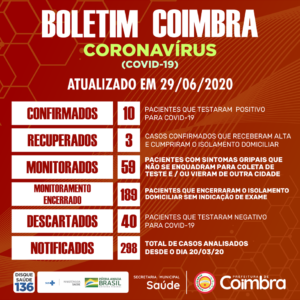 Boletim Diário, atualizações sobre coronavírus em Coimbra, 29/06/2020. Descrição dos pacientes que testaram positivo para covid-19 no município. 4º caso: paciente do sexo feminino, faixa etária entre 20 a 30
