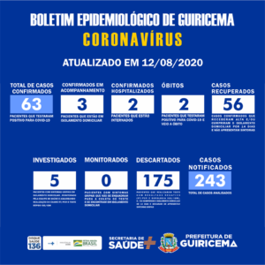 Boletim Diário, atualizações sobre coronavírus em Guiricema, 12/08/2020. ⠀ ?A Prefeitura Municipal de Guiricema, através da secretaria de saúde, segue o protocolo do estado e preza pela transparência nos dados,