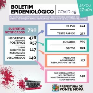 A atual situação do município de Ponte Nova é de setecentos e noventa (790) casos suspeitos notificados para infecção por coronavírus. Cinquenta e sete (57) casos foram confirmados, vinte e