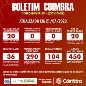 Nessa terça-feira (21), a Prefeitura de Coimbra divulgou que todos os casos confirmados de COVID-19 na cidade estão curados. A cidade registra 36 casos monitorados, 290 em monitoramento encerrado, 104