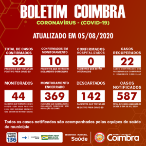 Boletim Diário, atualizações sobre coronavírus em Coimbra, 05/08/2020. ?Todos os casos que testaram positivo para covid-19 descritos no boletim são confirmados por exames laboratoriais. ?A Secretaria Municipal de Saúde informa