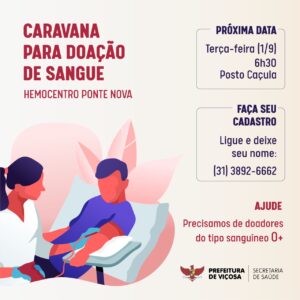 A Secretaria de Saúde, por meio do departamento de Vigilância em Saúde, irá organizar um grupo para doação de sangue em Ponte Nova na próxima terça-feira, dia 1°. Os atendimentos