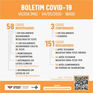 A Prefeitura de Viçosa divulgou o Boletim COVID-19 nessa segunda (04), às 18h00. De acordo com o boletim, há 58 casos investigados, estando 7 em isolamento aguardando resultado de teste,