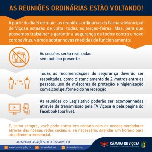 A partir dessa terça (05), as reuniões ordinárias da Câmara Municipal de Viçosa estarão de volta, todas as terças-feiras. Contudo, haverá novas medidas para o funcionamento: As sessões serão realizadas