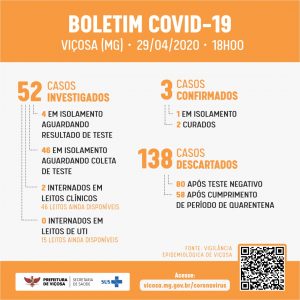 A Prefeitura de Viçosa divulgou o Boletim COVID-19 nessa quarta (29), às 18h00. De acordo com o boletim, há 52 casos investigados, estando 4 em isolamento aguardando resultado de teste,