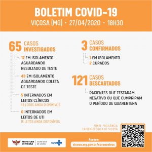 A Prefeitura de Viçosa divulgou o Boletim COVID-19 nessa segunda (27), às 18h30. De acordo com o boletim, há 65 casos investigados, estando 17 em isolamento aguardando resultado de teste,