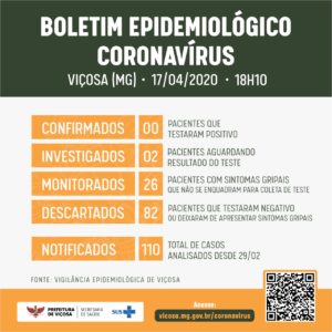 Na tarde dessa sexta (17), às 18h10, a Prefeitura de Viçosa divulgou o Boletim Epidemiológico do Coronavírus. No total, foram notificados na cidade 110 casos desde o dia 29 de