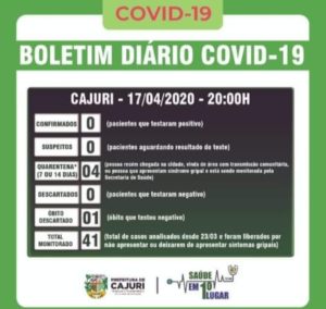 Na noite dessa sexta (17), às 20h, a Prefeitura de Cajuri divulgou o Boletim Epidemiológico do Coronavírus. No total, foram analisados na cidade 41 casos desde o dia 23 de