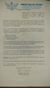A Prefeitura de Viçosa divulgou o Decreto 5437/2020, que implementou situação de emergência em saúde pública no município de Viçosa. Com isso, dentro do art. 15, inciso XIII da Lei