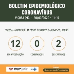 A vigilância epidemiológica de Viçosa divulgou o novo boletim municipal do Coronavírus na tarde dessa sexta (20). No boletim dessa sexta (20), Viçosa registrou 14 casos suspeitos do COVID-19, estando