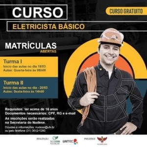Estão abertas as inscrições para o curso gratuito de Eletricista Básico. A Turma I começará no dia 18/03 e serão ministradas nas quartas-feiras, às 8h. A Turma II começará no