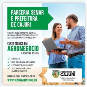 Um curso técnico em agronegócio gratuito será realizado em Cajuri. O curso é uma parceria entre o Senar e a Prefeitura de Cajuri. No curso, 80% das aulas são à