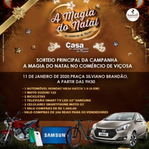 No próximo sábado (11), a partir das 9h30, na Praça Silviano Brandão, acontece o último sorteio da Campanha a Magia do Natal no Comércio de Viçosa, da Casa do Empresário.