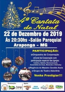 Neste domingo (22), acontece a 4ª Cantata de Natal de Araponga. A cantata será realizada às 20h30 no Salão Paroquial de Araponga. Haverá a participação da Orquestra da Corporação, do