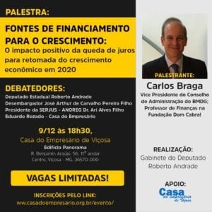 Na próxima segunda (09), será realizado em Viçosa, às 18h30, a palestra “Fontes de Financiamento para o Crescimento: O impacto positivo da queda de juros para retomada do crescimento econômico