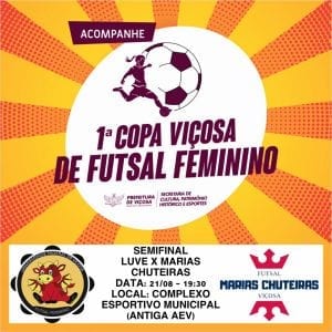 Nesta quarta (21), acontecerá a 1ª Copa Viçosa de Futsal Feminino no Complexo Esportivo Municipal (antiga AEV). O primeiro jogo, às 19h30, será entre Luve X Marias Chuteiras e às