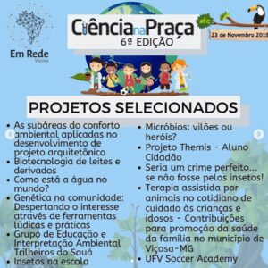 No próximo sábado (23/11) das 8h às 12h, ocorrerá, na Escola Estadual Dr. Raimundo Alves Torres (ESEDRAT), a 6ª Edição do Ciência na Praça! Através da exposição de pesquisas desenvolvidas, o público pode ter acesso a trabalhos