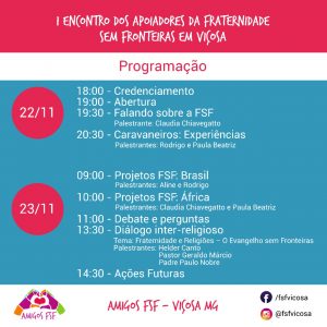 No próximo final de semana, dias 22 e 23 de novembro, voluntários do Fraternidade sem Fronteiras (FSF) irão promover um evento em Viçosa para divulgar as possibilidades de apoio ao