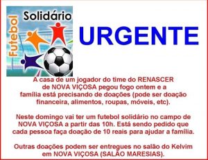 Será realizado neste domingo (04), em Nova Viçosa, um jogo de futebol solidário, em prol de uma família, que teve a casa queimada. Devido ao incêndio, a família perdeu tudo.