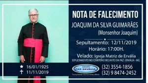 Nesta segunda-feira (11), faleceu o monsenhor Joaquim da Silva Guimarães da Paróquia São Sebastião de Ervália. Seu corpo foi velado na igreja matriz de São Sebastião e seu sepultamento será
