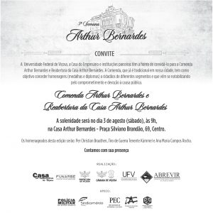 A Universidade Federal de Viçosa, a Casa do Empresário e instituições parceiras, convidam para comenda Arthur Bernardes e reabertura da casa Arthur Bernardes. A comenda, que já é tradicional em