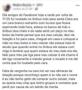 Na noite dessa terça (05), um jovem publicou nas redes sociais um furto de celular em um ônibus do Santa Clara, em Viçosa. Segundo o relato do jovem,ele estava no