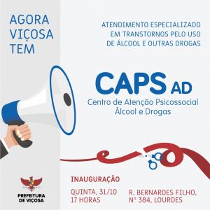 Acontece hoje, 31, a inauguração de uma unidade do Centro de Atenção Psicossocial – Álcool e Drogas, o CAPs – AD, em Viçosa. A nova divisão do serviço de saúde mental