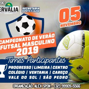 No dia 05 de novembro, acontecerá em Ervália, o Campeonato de Verão Futsal Masculino 2019. O jogo será às 19h15 na Quadra do Timbucão e contará com os times Progresso,