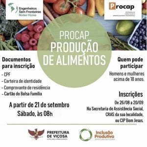Estão abertas as inscrições para o Programa de Capacitação e Aperfeiçoamento Profissional – Produção de Alimentos (PROCAP). A matrícula pode ser feita até o dia 20 setembro, na Secretaria de