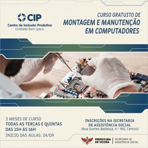 O Setor de Inclusão Produtiva da Secretaria Municipal de Assistência Social – SMAS, oferecerá um curso gratuito de montagem e manutenção de computadores. As aulas começam no dia 24 de