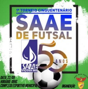 Acontecerá no dia 22/09, o 1º Torneio Cinquentenário SAAE de Futsal, às 9h. Os jogos serão realizados no Complexo Esportivo Municipal.