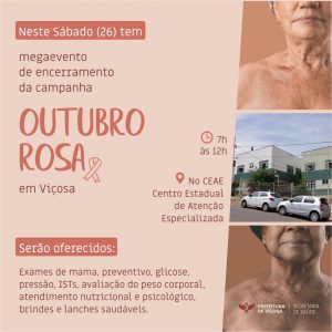 A Prefeitura Municipal de Viçosa realizará amanhã, sábado (26) um megaevento de encerramento da campanha Outubro Rosa em Viçosa. O evento será de 7h às 12h no CEAE (Centro Estadual