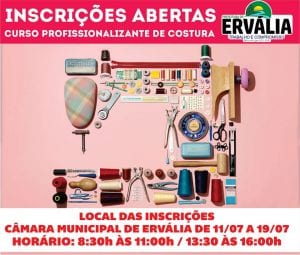 Estão abertas as inscrições para o curso profissionalizante de costura oferecido pela prefeitura municipal de Ervália, com o apoio de comerciantes locais do ramo da confecção. As inscrições serão realizadas