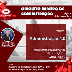 No dia 5 de novembro, por volta das 19h, acontece em Viçosa o Circuito Mineiro de Administração. O Presidente do CRA-MG Adm. Jehu Pinto de Aguilar Filho irá ministrar a