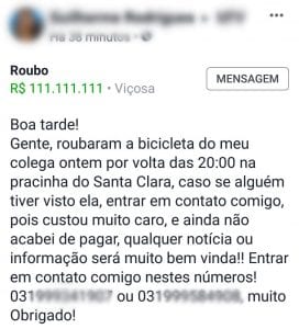 Hoje (10), um usuário relatou em uma rede social um roubo de uma bicicleta na pracinha do Santa Clara, em Viçosa. Na publicação, o usuário também divulgou uma foto da