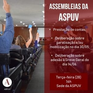 ASSEMBLEIA HOJE NA ASPUV IRÁ DEBATER ADESÕES A MOBILIZAÇÃO NO DIA 30/05 E GREVE GERAL DIA 14/06