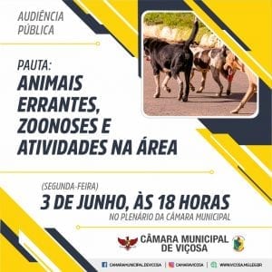 Na segunda-feira, dia 03 de junho, será realizado às 18h, uma audiência pública que terá como pauta os animais errantes, zoonoses e atividades na área. A audiência será realizada no