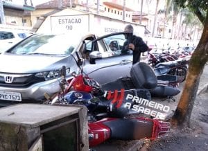 Na tarde de ontem (08), por volta das 17h, uma motorista perdeu o controle do veículo e bateu em algumas motos que estavam estacionadas próximo ao balaustre, na rua Professor