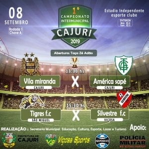 Neste domingo (08), acontece a rodada 1 da chave A, do 1º Campeonato Intermunicipal de Cajuri de 2019. Abertura: Taça Zé Adão. O campeonato será realizado no Estádio Independente Esporte