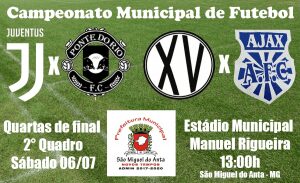 Neste sábado (06), será realizado em São Miguel do Anta, o Campeonato Municipal de Futebol no Estádio Municipal Manuel Rigueira. Os primeiros jogos, do 2º quadro, quartas de final, serão