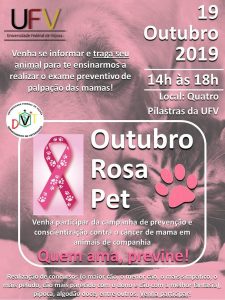 O curso de Medicina Veterinária da UFV promoverá neste sábado (19), das 14h às 18h, o evento Outubro Rosa Pet, nas Quatro Pilastras. O objetivo é conscientizar a população sobre o câncer de