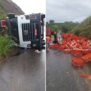 Caminhão carregado com frangos tomba no trevo da reciclagem em Viçosa