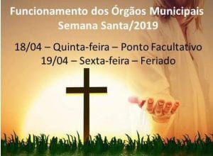 FUNCIONAMENTO DOS ÓRGÃOS MUNICIPAIS – SEMANA SANTA/2019 – Dia 18/04 (quinta-feira) – Ponto Facultativo em todas as Unidades Administrativas da Prefeitura, excetuando-se as Unidades que prestam serviços considerados como essenciais. (Decreto